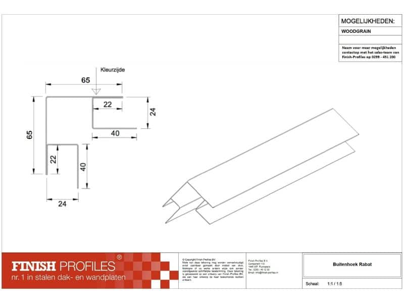 Dit veelzijdige eindstuk kan worden geïnstalleerd bij zowel het Holland Rabat als ons eigen Finish Rabat. Net als onze wandprofielen is dit zetwerk beschikbaar in de Woodgrain coating. Deze coating is vanzelfsprekend onderhoudsarm, waardoor schilderen niet langer noodzakelijk is. Bovendien voegt de Woodgrain coating een vleugje luxe toe door de realistische houtstructuur die de gevelbekleding krijgt, waardoor deze doet denken aan echte houten rabat planken.